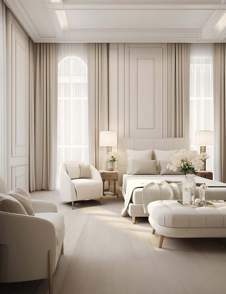 O espaço negativo também é muito importante aqui, seja um teto alto ou móveis espalhados pelo cômodo. As cores serão neutras, talvez com um tom de destaque.